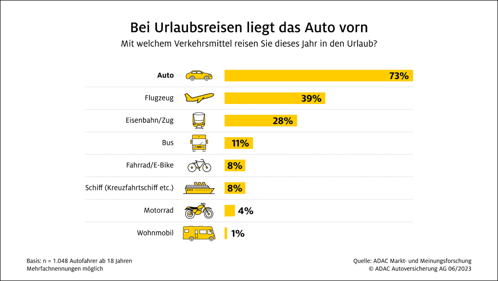 - Umfrage der ADAC Autoversicherung: Das Auto ist 2023 das meistgenutzte Verkehrsmittel für Urlaubsreisen