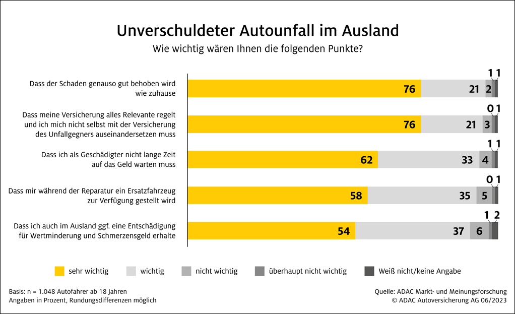 Dieser Zusatzschutz, der in der Regel nur 10 bis 20 Euro im Jahr kostet, kann Reisenden durchaus Ärger ersparen. Denn laut Umfrage wünschen sich Autofahrer im Schadenfall vor allem einen unkomplizierten Ablauf der Regulierung. 96 Prozent fänden es wichtig oder sehr wichtig, dass ihre Versicherung auch bei einem unverschuldeten Autounfall im Ausland alles Relevante regelt und sie sich nicht selbst mit der Versicherung des Unfallgegners auseinandersetzen müssen. Fast genauso viele, nämlich 95 Prozent, geben an, dass sie als Unfallgeschädigte nicht lange auf das Geld warten wollen. Beide Vorteile gehören zu den typischen Leistungen eines Auslandsschadenschutzes. Die ADAC Autoversicherung empfiehlt daher, vor Reisen ins Ausland den Versicherungsschutz zu überprüfen – damit der Urlaub auch wirklich zur Erholung wird.