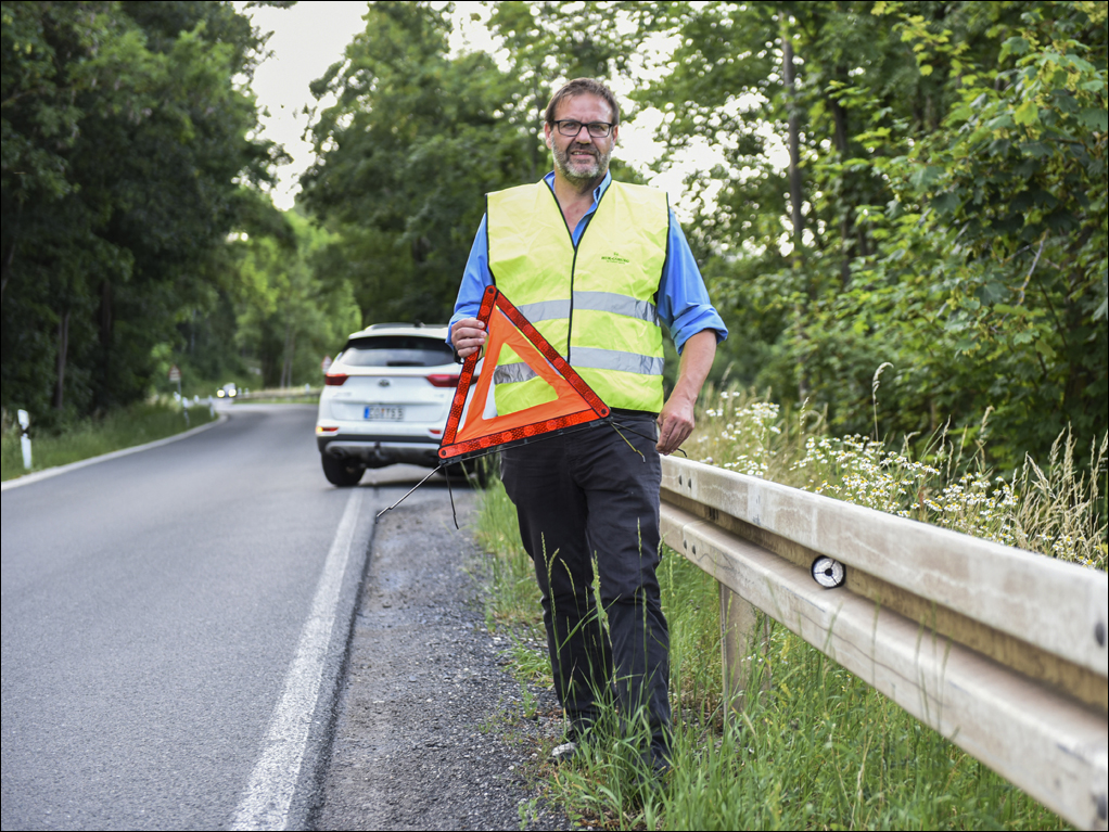 Genauso wichtig wie die Warnweste ist das Absichern der Unfallstelle mit einem Warndreieck. Liegt die Unfallstelle in einer Kurve oder vor einer Kuppe, muss das Dreieck immer davor aufgestellt werden. Am wichtigsten ist, die anderen Verkehrsteilnehmer rechtzeitig und deutlich sichtbar vor der Gefahrenstelle zu warnen.