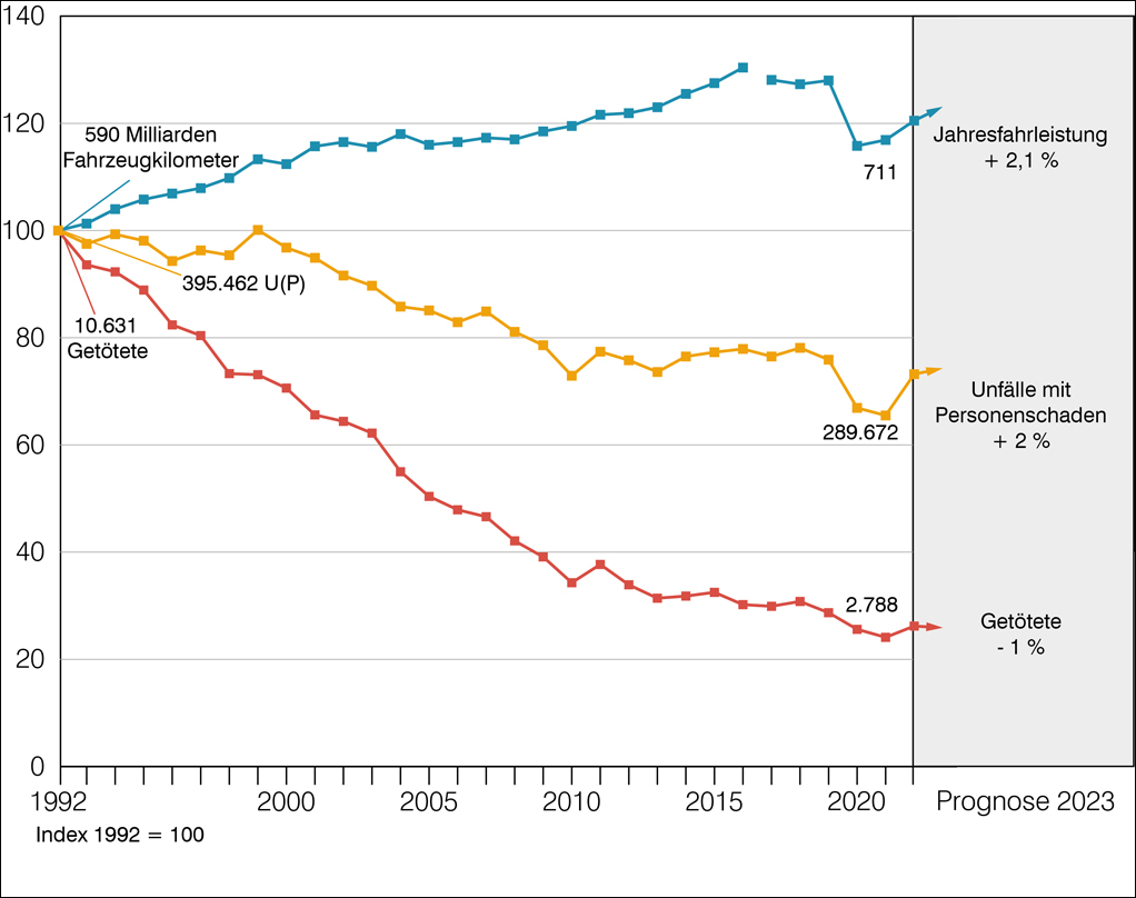 Bei der Zahl der Unfälle mit Personenschaden wird im Vergleich zum Vorjahr ein Anstieg auf etwa 294.000 Unfälle erwartet (2022: 289.672). Die Zahl der Verunglückten wird dabei auf rund 370.000 Personen ansteigen (2022: 363.922).