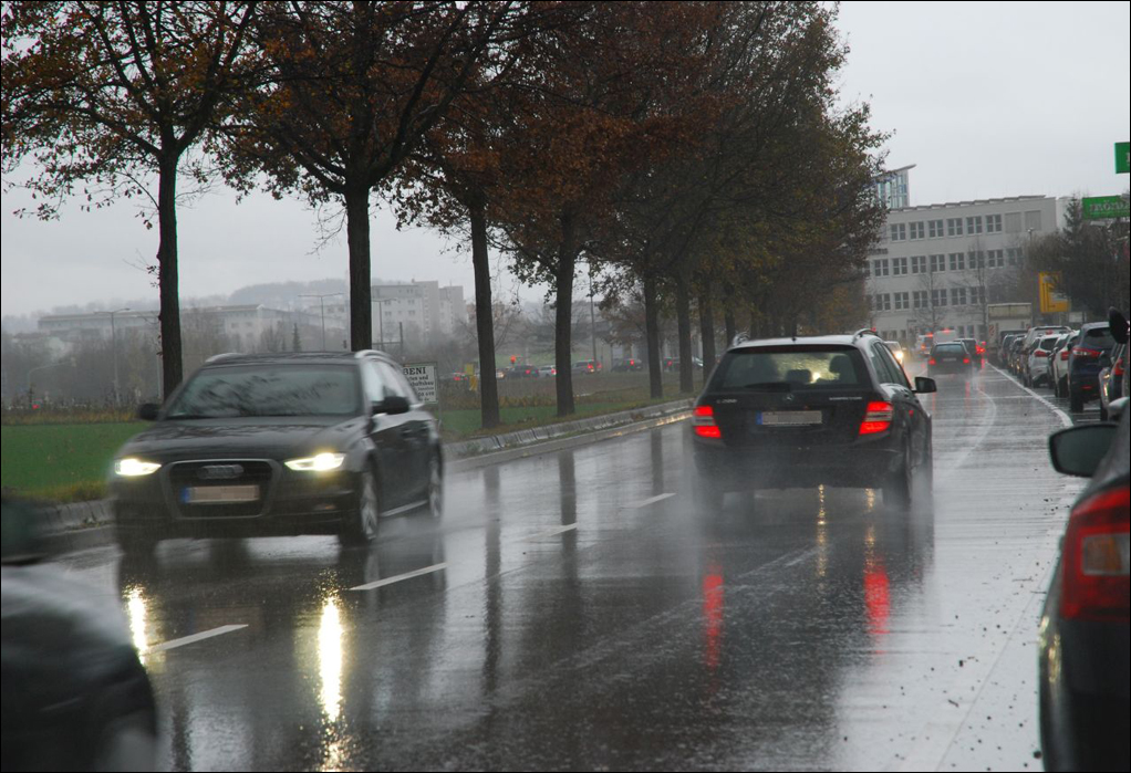 „Die Konsequenz kann nur sein, vorsichtiger zu fahren und den Sicherheitsabstand zu vergrößern, wenn die Straße nass oder feucht ist“, betont der Experte. Besonders in Kurven ist eine weniger schwungvolle Fahrweise gefragt. Neben einer geringeren Verzögerung in Längsrichtung sind auch die übertragbaren Seitenführungskräfte geringer, so dass ein Fahrzeug schneller von der Fahrbahn abkommen kann. Außerdem kann Regen die Sicht der Fahrenden teils erheblich einschränken. Auf der Autobahn können laut BGH bei Starkregen schon 80 km/h zu schnell sein.