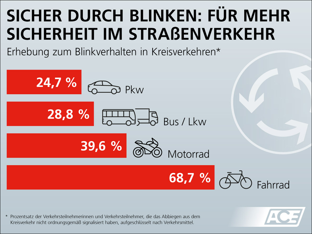 Insgesamt wurden 19.785 Verkehrsteilnehmende im Auto, auf dem Fahrrad oder Motorrad und im Bus oder Lkw beim Herausfahren aus dem Kreisverkehr beobachtet. Fehler machten dabei mit 26,6 Prozent mehr als ein Viertel. Aus Sicht des ACE ein erschreckendes Ergebnis. Besonders auffällig: Die meisten Fehler machten mit großem Abstand Radfahrende – 68,7 Prozent gaben kein entsprechendes Handzeichen. Mit 39,6 Prozent sind Motorradfahrende die zweitgrößten Blinkmuffel. Etwas besser schnitten in der Verkehrsbeobachtung Busse, Lkws und Sprinter ab, wobei in dieser Gruppe vor allem Sprinter Fehlverhalten an den Tag legten. Knapp ein Drittel gab kein Blinkzeichen zum Anzeigen der Fahrtrichtung. Pkws schnitten insgesamt am besten ab, auch wenn diese Gruppe nicht fehlerfrei unterwegs war: In 24,7 Prozent konnte ein Fehlverhalten beobachtet werden.