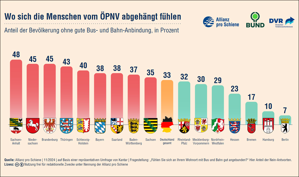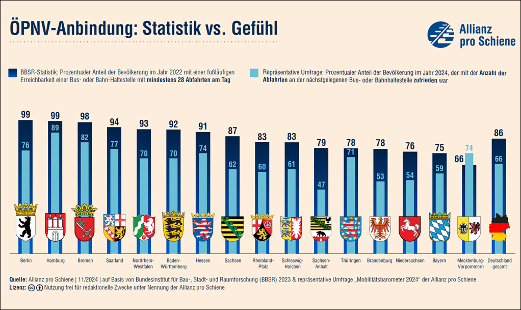Dazu sagte der Geschäftsführer der Allianz pro Schiene, Dirk Flege: „Mehr als 80 Prozent der Menschen beklagen entweder Stillstand oder sogar eine Verschlechterung des ÖPNV-Angebots am eigenen Wohnort. Die Antwort darauf kann unmöglich sein, das Deutschlandticket ständig infrage zu stellen. Die Politik muss das Ticket für die Zukunft sichern und gleichzeitig das Angebot spürbar verbessern. Die Menschen haben die Erwartung, dass sie ihr Ticket im ganzen Land nutzen können. Und da klaffen Anspruch und Wirklichkeit insbesondere im ländlichen Raum weit auseinander. Aus der Befragung lässt sich ein Auftrag an die Politik ableiten, mit den Erwartungen der Menschen Schritt zu halten und ein besseres Angebot bereitzustellen.“