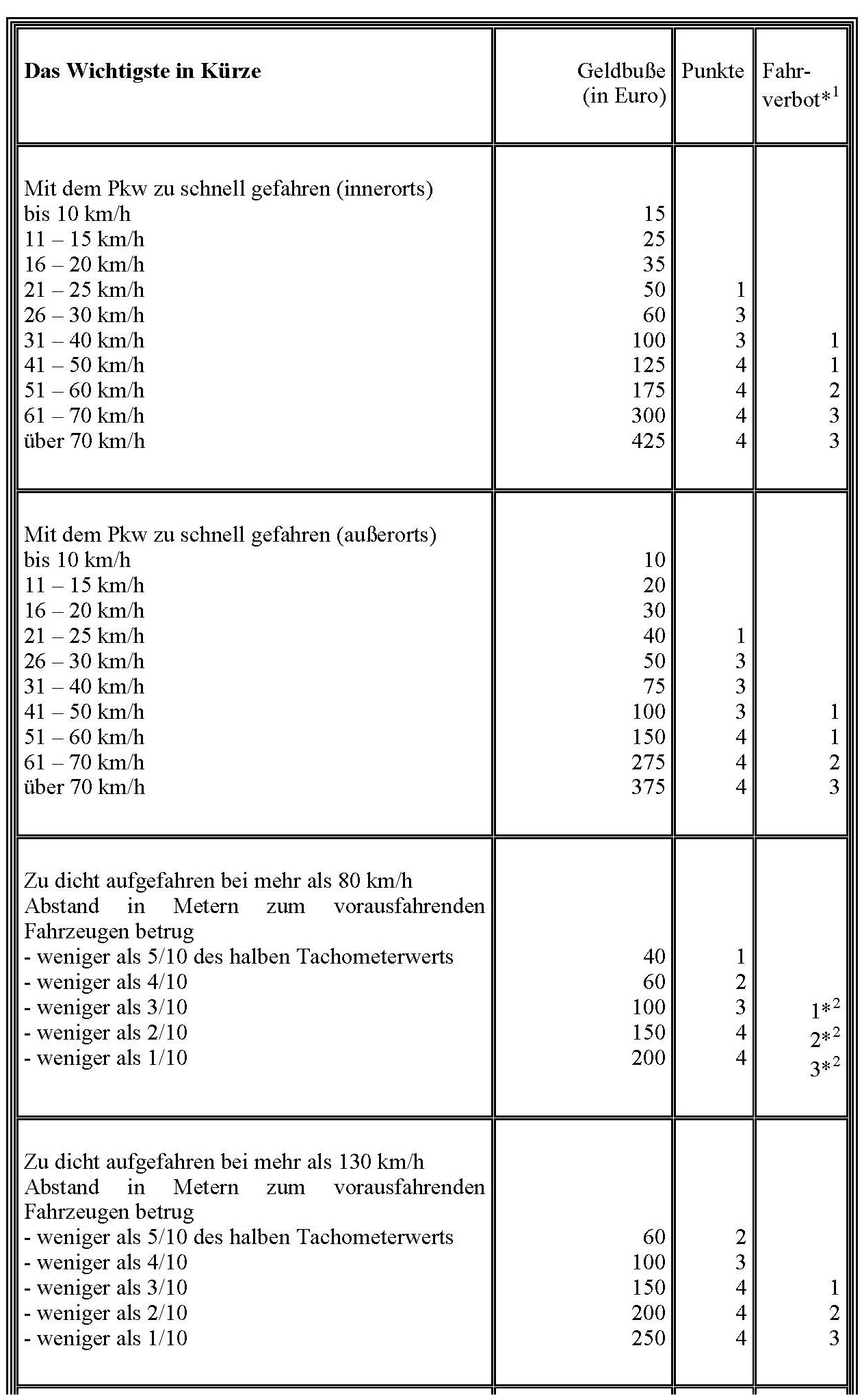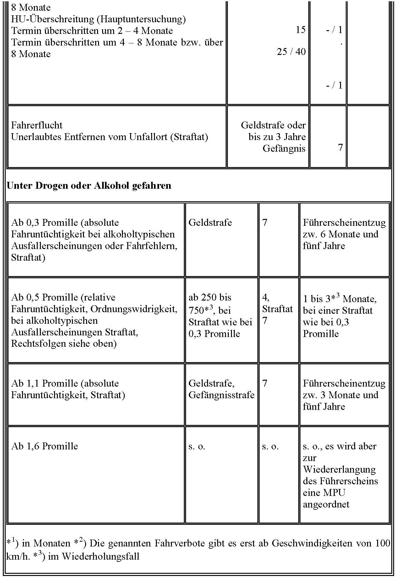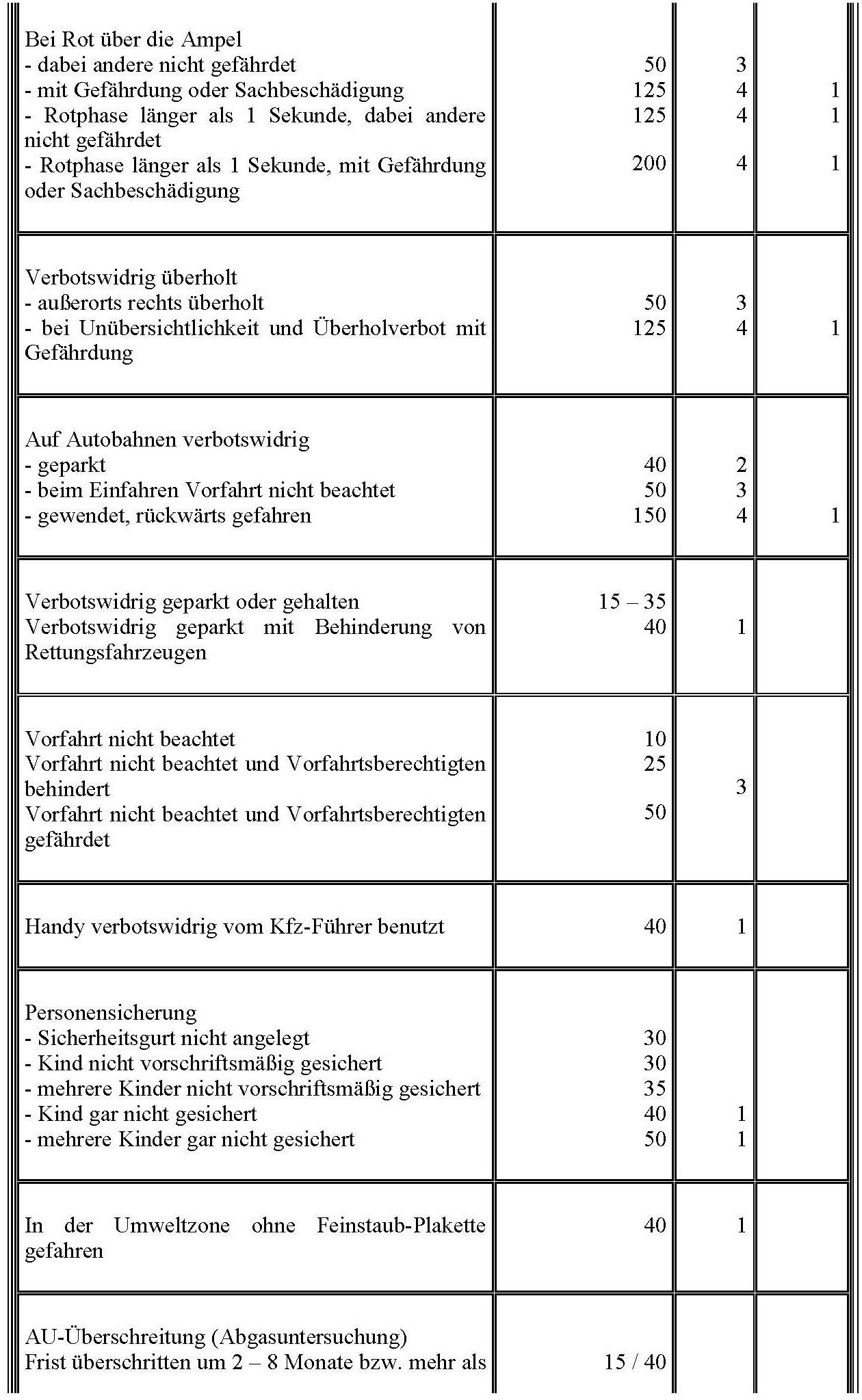 Kleinere Vergehen werden mit einem so genannten Verwarnungsgeld belegt, das bis zu 35 Euro beträgt. Ab 40 Euro Bußgeld wird der Verstoß in der Verkehrssünderkartei eingetragen und es gibt bis zu vier Punkte. Verkehrsstraftaten werden mit Geldbußen ab 750 Euro und mindestens fünf Punkten sowie Fahrverboten oder gar Führerscheinentzug geahndet. Bleibt man zwei Jahre nach Eintragung der Punkte ohne weitere Einträge, werden die Punkte gelöscht, ansonsten erst nach fünf Jahren.